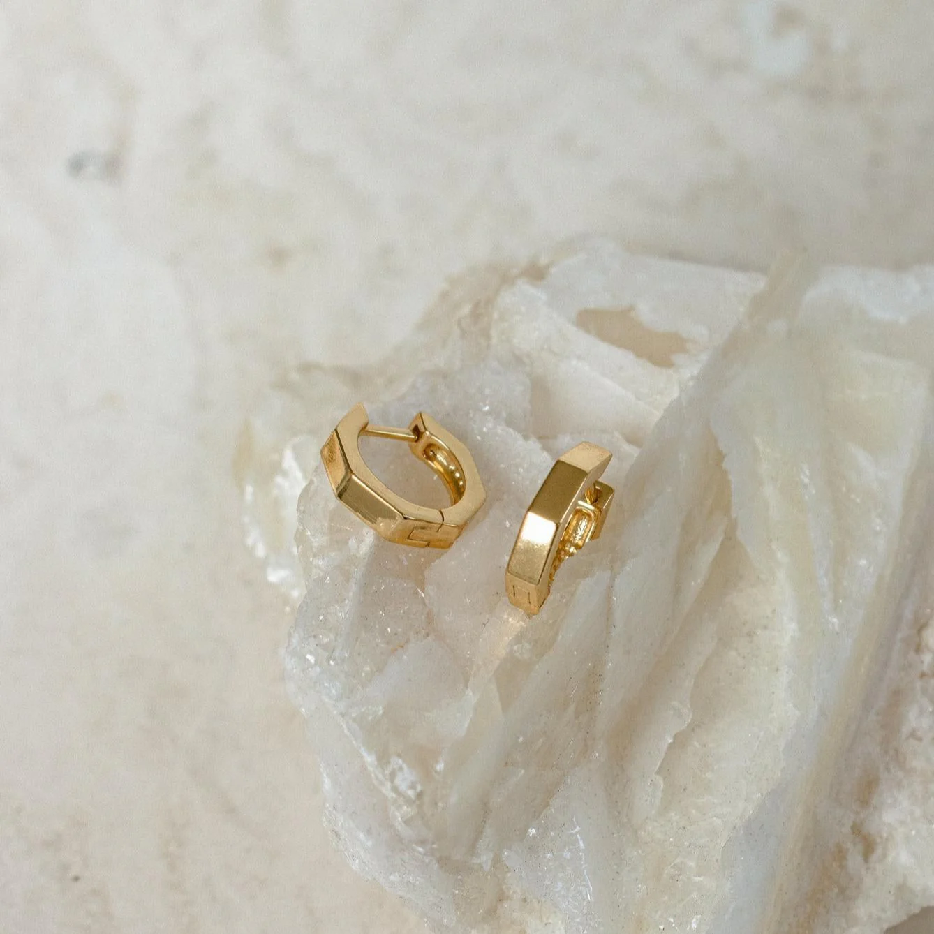Our Audrey Huggies make for a great accessory to elevate your everyday look. These hexagon shaped earrings have the right amount of shine. Wear on its own for a cute simple look, or stack them with complementing earrings for extra sparkle.