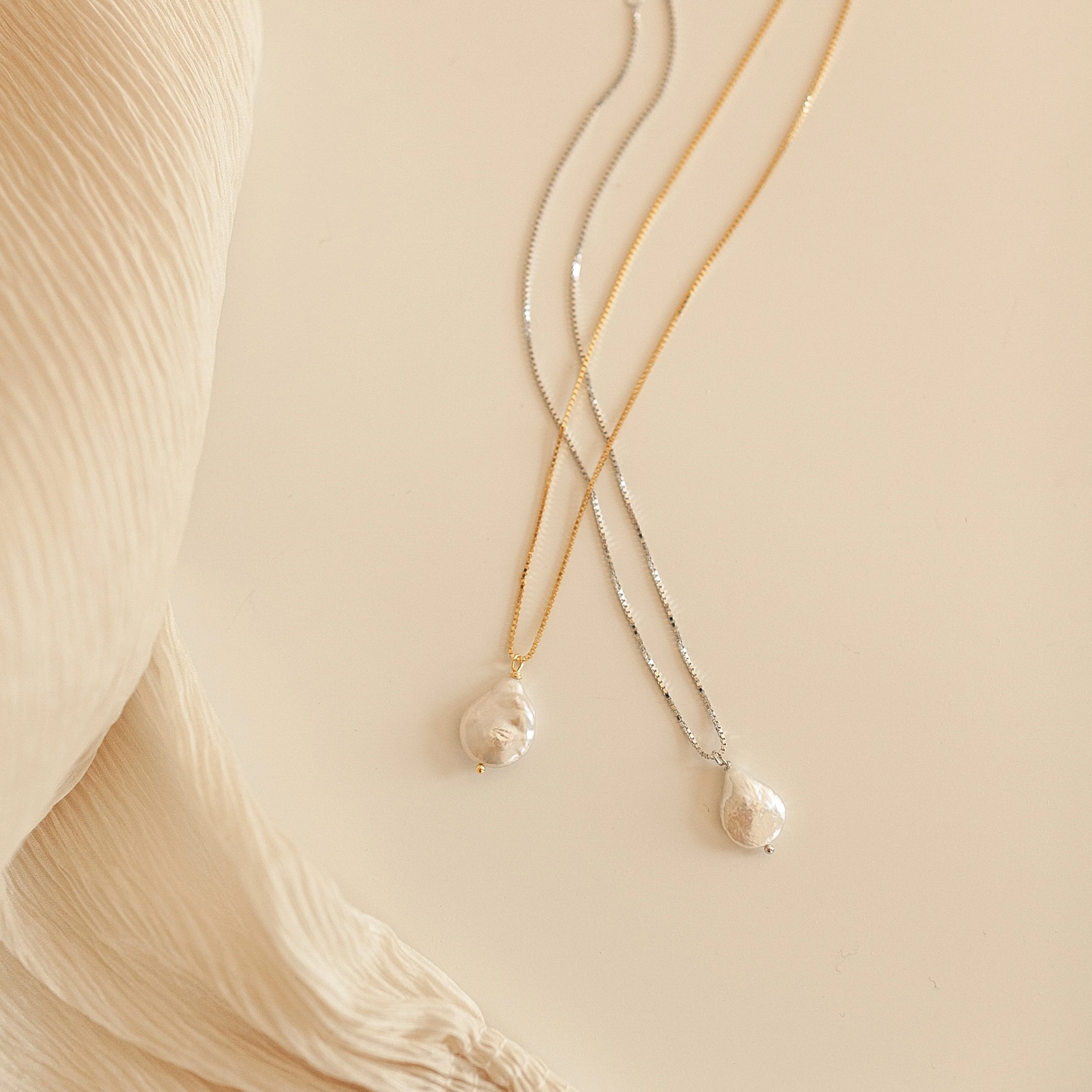Behold the Sadie Baroque Necklace: A striking, teardrop-shaped freshwater pearl is strung along a smooth and glossy chain, for a polished and luxurious appearance. The perfect Bridesmaids or Baby Shower gift.