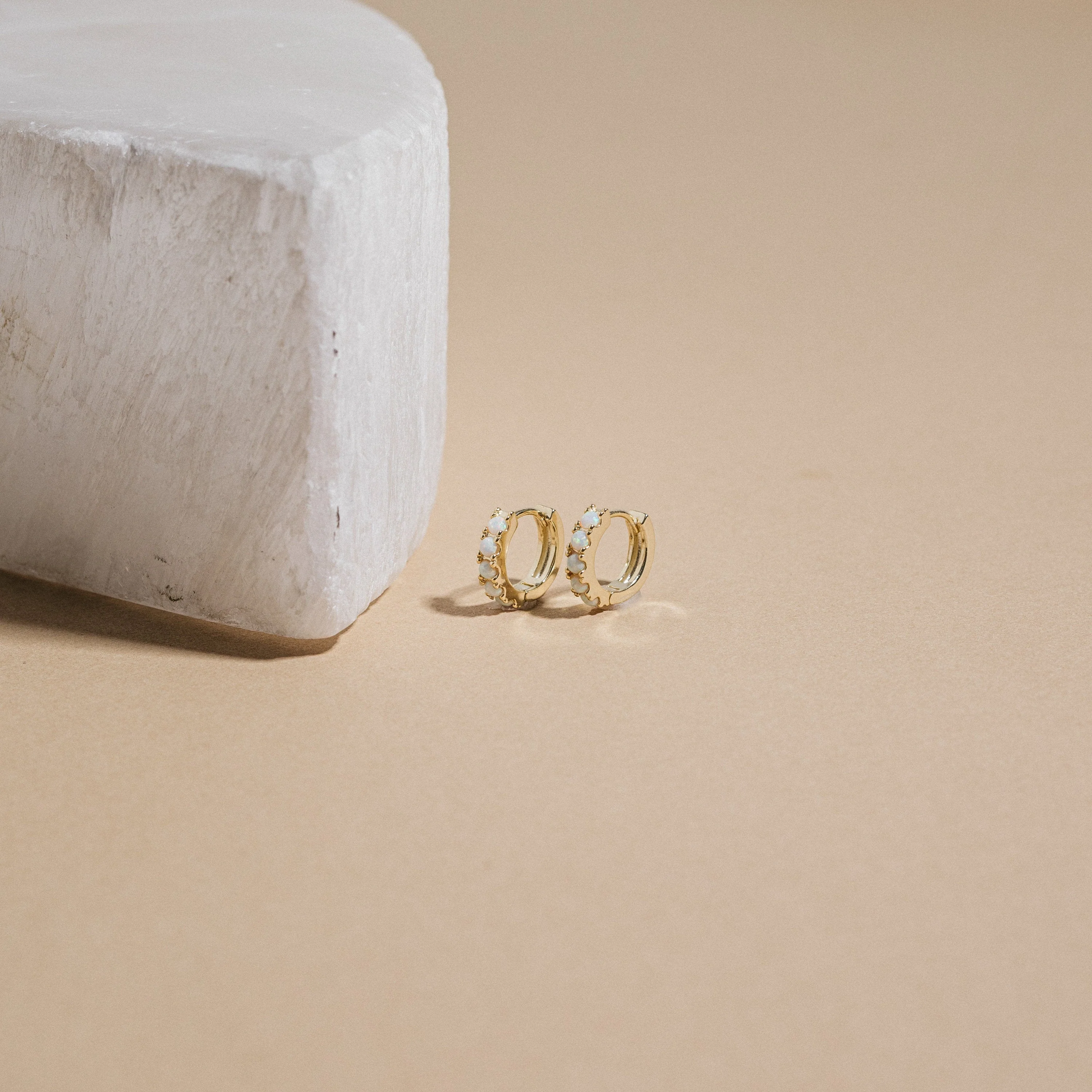 The Opal Huggies will gracefully add charm and sophisticated elegance to your earlobes, in a minimal and understated manner. The beautiful opal studded band will perfectly complement any outfit, due to its neutral tone. Wear day and night, and pair with some diamond-encrusted danglies for a bolder look.